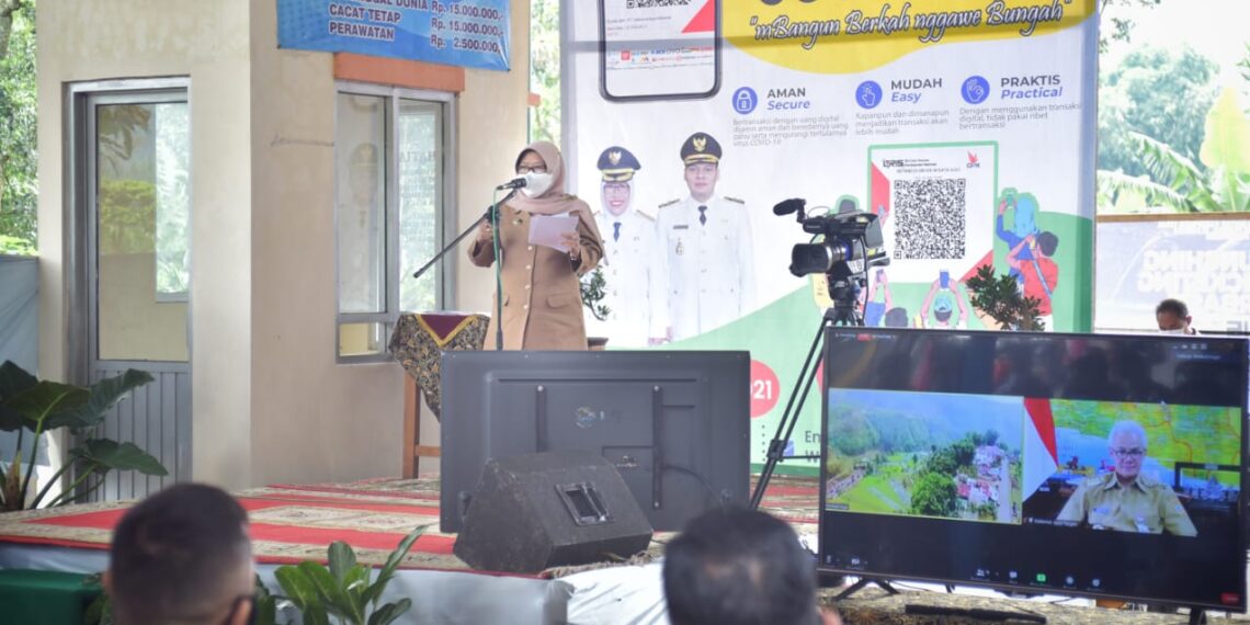 Bupati Tegal Umi Azizah bersama perwakilan Bank Indonesia saat melakukan simulasi pembayaran nontunai tiket masuk objek wisata alam Guci secara virtual menggunakan QRIS bersama Gubernur Jawa Tengah Ganjar Pranowo, Senin (15/03/2021).