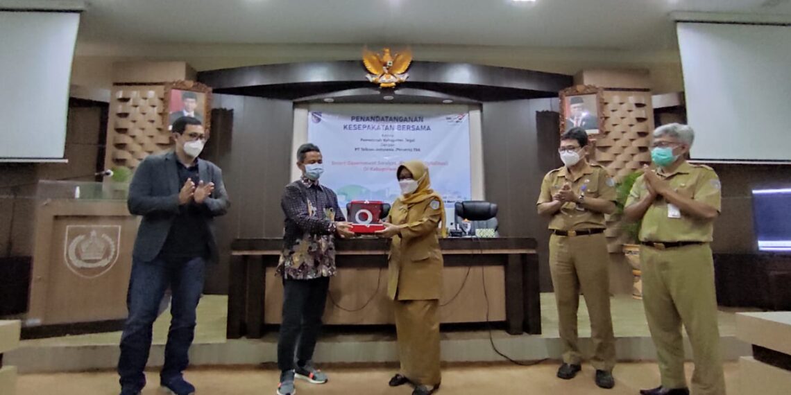 Slawi – Guna mendukung percepatan layanan pemerintahan yang cerdas atau smart goverment services, Bupati Tegal Umi Azizah menjalin kerjasama dengan PT Telekomunikasi Indonesia (Persero) Tbk. Pada penandatangan nota kesepahaman yang berlangsung di Ruang Rapat Bupati Tegal, Selasa (16/03/2021) siang, Umi berharap layanan Pemkab Tegal bisa berjalan lebih cepat, efektif dan efisien.