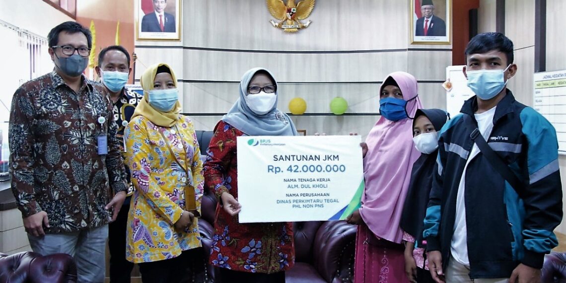 Slawi – Ahli waris Dul Kholil, pegawai non ASN Pemkab Tegal yang meninggal dunia beberapa waktu lalu mendapat santunan jaminan kematian dari Badan Penyelenggara Jaminan Sosial (BPJS) Ketenagakerjaan. Penyerahan klaim sebesar Rp 42 juta tersebut berlangsung di ruang kerja Bupati Tegal Umi Azizah, Kamis (22/04/2021) pagi.