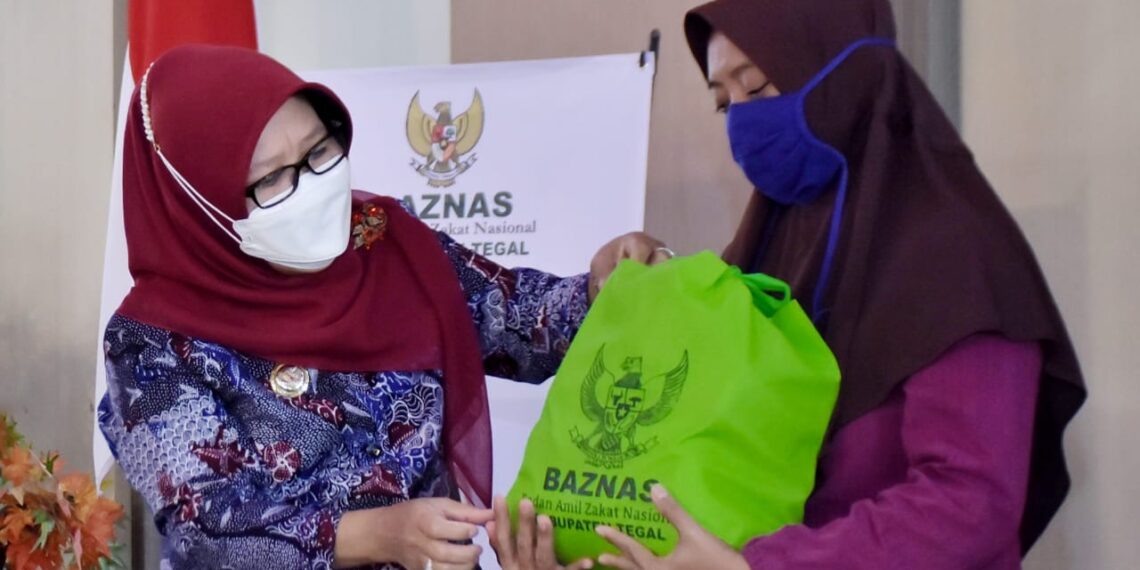 Slawi – Badan Amil Zakat Nasional (Baznas) Kabupaten Tegal membagikan 450 paket sembako kepada mustahik atau orang yang berhak menerima zakat. Penyaluran paket sembako tersebut dilakukan secara simbolis oleh Bupati Tegal Umi Azizah kepada perwakilan tiga orang penerima zakat di Pendopo Amangkurat Kantor Pemerintah Kabupaten Tegal, Kamis (29/04/2021) pagi.