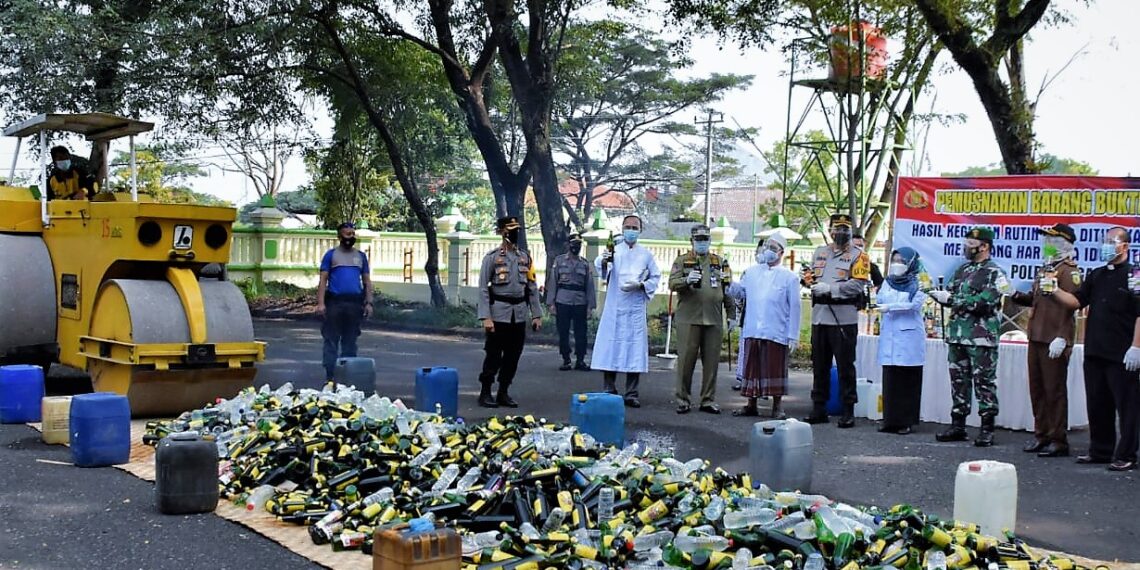 Slawi – Usai pimpin Apel Gelar Pasukan Operasi Ketupat 2021 di lapangan Pemda pada Rabu (05/05/2021), Bupati Tegal Umi Azizah saksikan pemusnahan barang bukti 8.000 botol minuman keras (miras) yang disita dari perkara pidana ringan penjualan miras tanpa izin. Pemusnahan miras dari berbagai jenis dan merek tersebut dipimpin langsung Kepala Kepolisian Resor (Kapolres) Tegal AKBP Muhammad Iqbal Simatupang dan disaksikan unsur Forum Komunikasi Pimpinan Daerah (Forkopimda) Kabupaten Tegal.