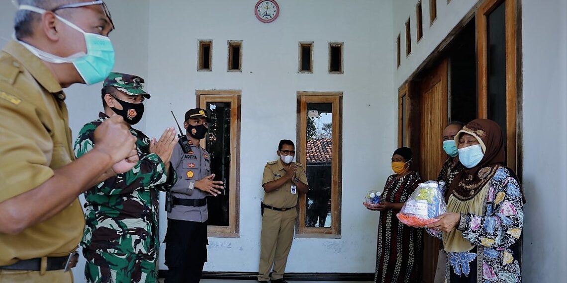 Juru Bicara Satgas Penanganan Covid-19 Kabupaten Tegal Joko Wantoro (kiri) bersama unsur Forkopimcam Kramat saat memberikan bantuan makanan dan minuman suplemen kepada tiga orang warga Desa Bangun Galih yang sedang menjalani isolasi mandiri dengan menempati salah satu rumah milik kepala dusun setempat yang diperuntukkan sebagai tempat isolasi mandiri, Senin (24/05/2021). Saat itu, tercatat ada enam orang warga Bangun Galih yang sedang menjalani isolasi mandiri di rumah penampungan tersebut.