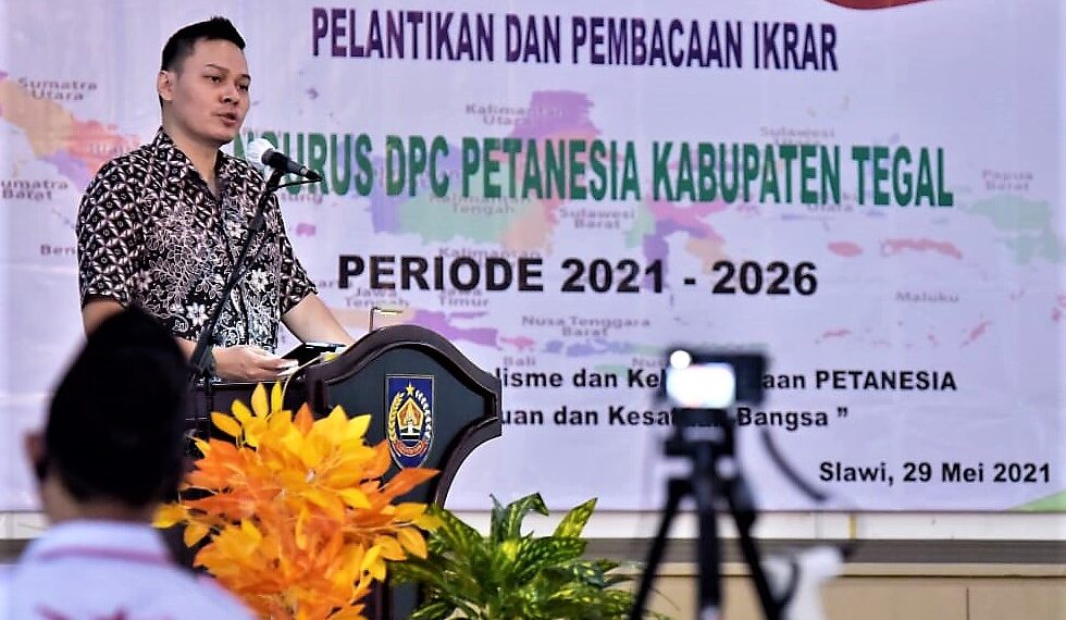 Slawi – Organisasi Pecinta Tanah Air Indonesia (Petanesia) kini hadir di Kabupaten Tegal. Sebanyak 113 pengurus Petanesia Kabupaten Tegal periode 2021-2026 resmi dilantik oleh Ketua Dewan Fatwa DPP Petanesia Muhammad Muatoh, Sabtu (29/05/2021) di Pendopo Amangkurat. Acara pelantikan dihadiri oleh Wakil Bupati Tegal Sabilillah Ardie.
