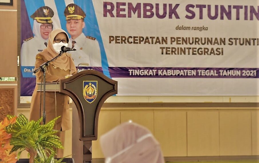 Slawi – Stunting atau tubuh kerdil pada anak atau tengkes menjadi indikasi perkembangan otak dan sel tubuh anak tidak berkembang optimal. Kondisi itu akan berdampak pada tingkat kecerdasan, kemampuan kognitif dan kesehatannya ke depan karena mudah sakit. Pernyataan ini disampaikan Bupati Tegal Umi Azizah saat membuka acara Rembuk Stunting di Pendopo Amangkurat, Selasa (22/06/2021).