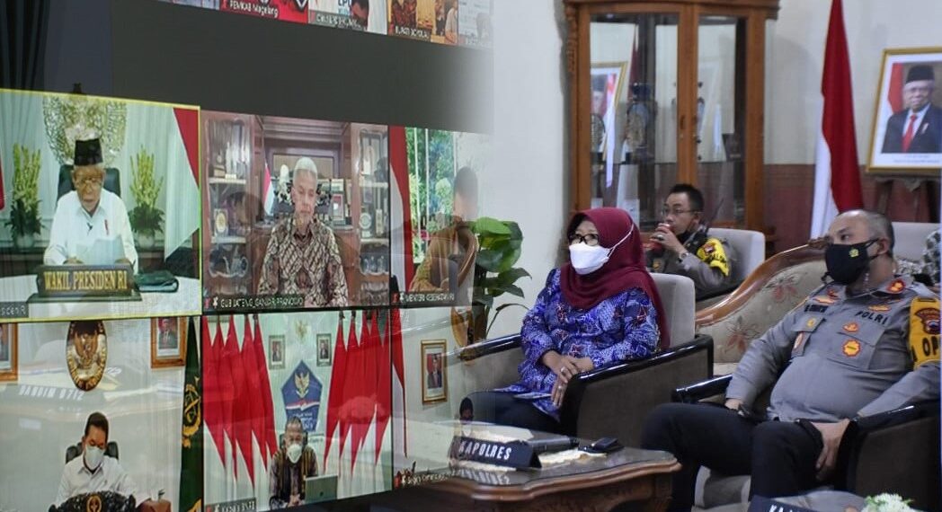 Slawi – Gubernur Jawa Tengah Ganjar Pranowo meminta seluruh jajaran satgas Penanganan Covid-19 di Jawa Tengah mengoptimalkan peran satgas Jogo Tonggo untuk menekan risiko kematian pasien isolasi mandiri (isoman). Hal tersebut disampaikannya pada acara konferensi video bersama Wakil Presiden Ma’ruf Amin, Jumat (23/07/2021) siang yang juga disaksikan Bupati Tegal Umi Azizah dari rumah dinasnya bersama unsur Forkopimda Kabupaten Tegal.