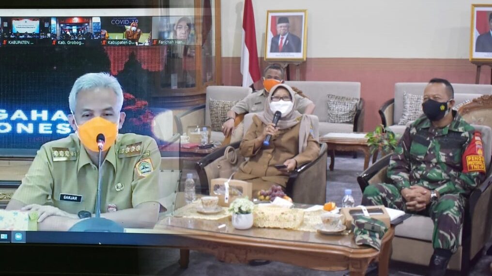 Slawi – Tingginya antusiasme warga Kabupaten Tegal untuk mendapatkan suntik vaksin Covid-19 di tengah keterbatasan pasokannya, menjadikan daftar tunggunya semakin lama hingga 20 hari. Hal tersebut disampaikan Bupati Tegal Umi Azizah kepada Gubernur Jawa Tengah Ganjar Pranowo saat berlangsung konferensi video pengarahan tentang Penanganan Covid-19 di Jawa Tengah, Senin (26/07/2021) siang.