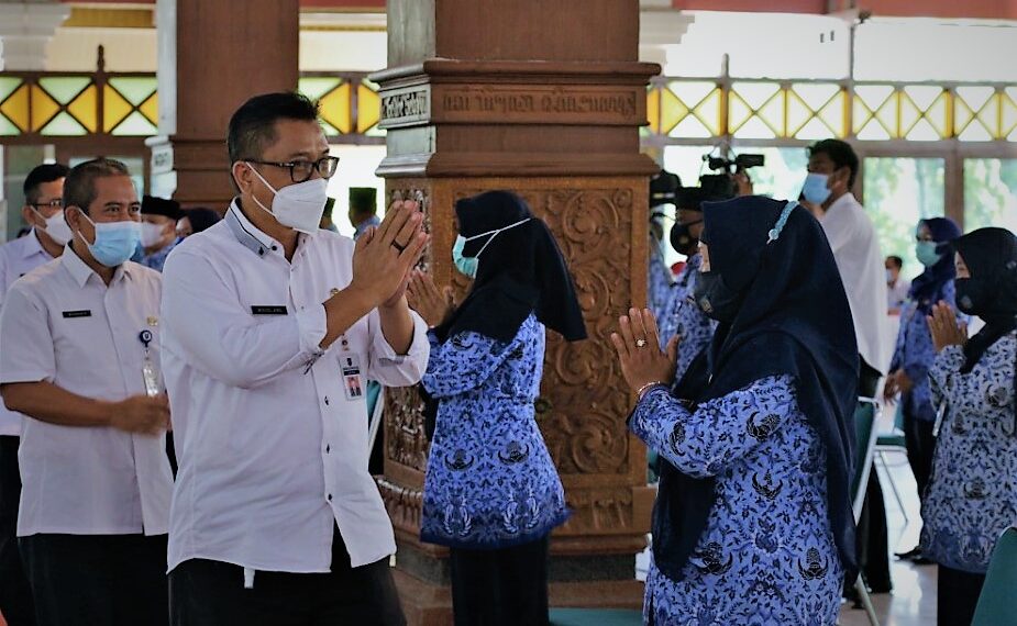 Pesan tersebut disampaikan Sekretaris Daerah Kabupaten Tegal Widodo Joko Mulyono saat secara simbolis menyerahkan surat keputusan (SK) kenaikan pangkat periode 1 Oktober 2021 kepada 379 Pegawai Negeri Sipil (PNS) Pemkab Tegal golongan IV, III dan II di Pendopo Amangkurat, Rabu (08/09/2021) pagi.