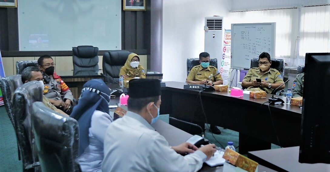 Bupati Tegal Umi Azizah saat mengikuti rapat virtual koordinasi penanganan Covid-19 tingkat Jawa Tengah dari ruang rapat Sekretaris Daerah Kabupaten Tegal, Selasa (14/09/2021). Rapa ini dipimpin langsung Gubernur Jawa Tengah Ganjar Pranowo.