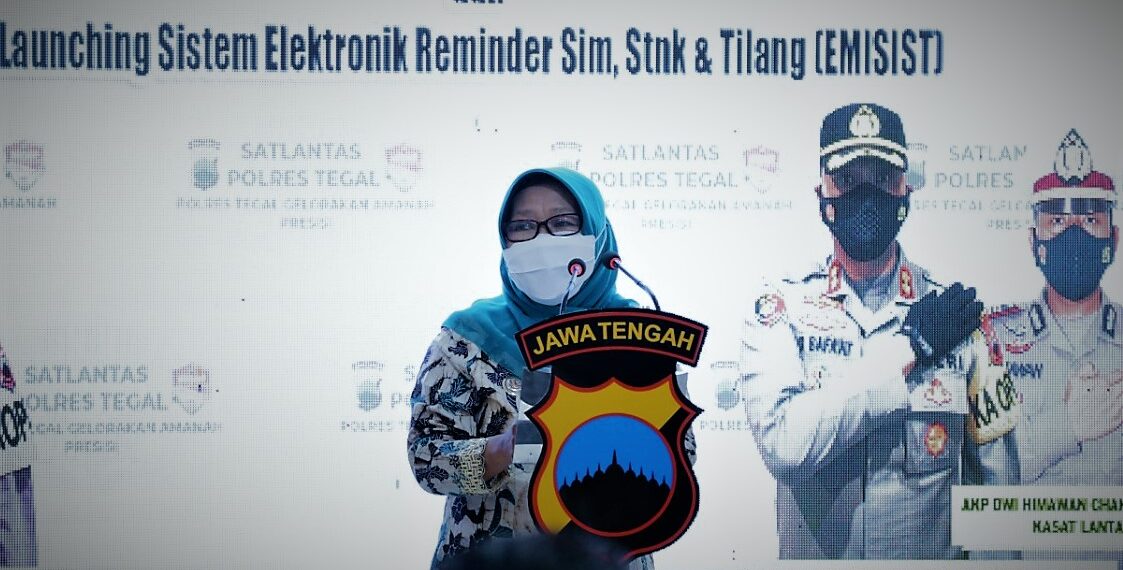 Bupati Tegal Umi Azizah menyampaikan apresiasinya pada peluncuran electronic reminder SIM, STNK dan tilang (Emisist) di Ruang Praja Gupta Mako Polres Tegal Kamis (23/09/2021).