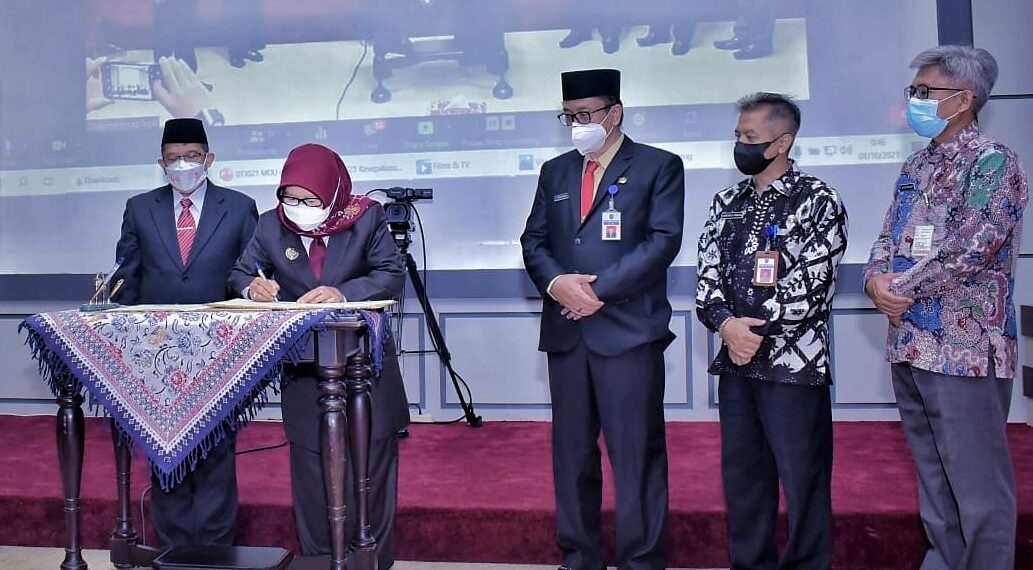 Bupati Tegal Umi Azizah menandatangani nota kesepakatan pengembangan smart city dan peningkatan SDM bidang komunikasi dan informatika di Kabupaten Tegal dengan Kepala Badan Penelitian dan Pengembangan Sumber Daya Manusia (Balitbang SDM) Kemkominfo Hary Budiarto di Gedung Dadali, Jumat (01/10/2021) pagi.