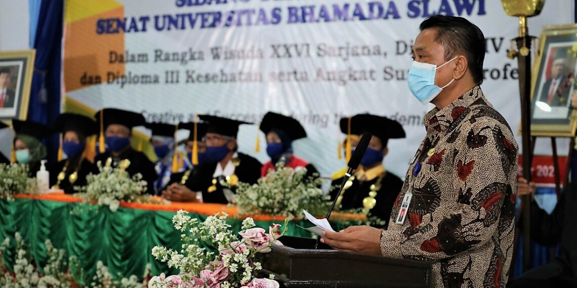 Keterangan tersebut disampaikan Sekretaris Daerah Kabupaten Tegal Widodo Joko Mulyono pada acara wisuda ke-26 program sarjana dan diploma kesehatan serta angkat sumpah profesi kesehatan di Universitas Bhamada Slawi, Kamis (14/10/2021) pagi. Acara wisuda daring ini dihadiri oleh 12 orang wisudawan-wisudawati terbaik sebagai representasi 410 lulusan Universitas Bhamada Slawi yang diwisuda pada kesempatan tersebut.