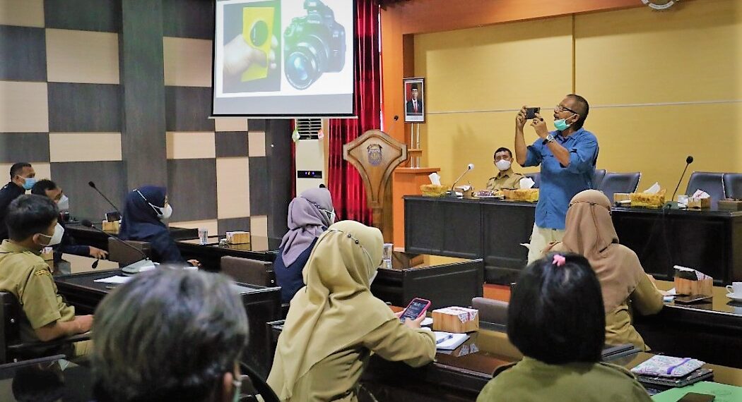 Slawi – Sebanyak 30 orang peserta dari kehumasan organisasi perangkat daerah di lingkungan Pemkab Tegal dan instansi mitra Pemda ikuti kegiatan workshop fotografi jurnalistik. Wartawan dan fotografer senior Arbain Rambey menjadi pemateri pada pelatihan sehari yang berlangsung di ruang Lokabina Cipta, Bappeda dan Litbang Kabupaten Tegal, Selasa (02/11/2021) siang.