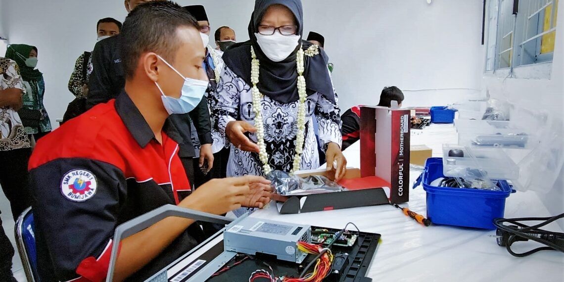 Bumijawa – Usai pimpin upacara Hari Guru Nasional 2021 di SMP Negeri 1 Bumijawa, Bupati Tegal Umi Azizah luncurkan NesbuOne, laptop dan komputer rakitan karya siswa Sekolah Menengah Kejuruan Negeri (SMKN) 1 Bumijawa, Kamis (25/11/2021) siang. Usai peluncuran produk ini, Umi pun meninjau ruang bengkel perakitan komputer. Di sini, tampak sejumlah siswa tengah mengerjakan pesanan laptop konsumen, termasuk pesanan dari pemerintah desa dan Pemda.