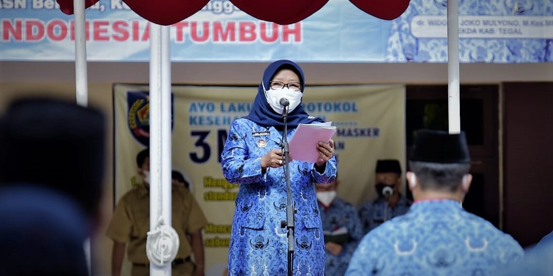 Slawi – Korps Pegawai Republik Indonesia (Korpri) harus menjadi pilar utama pemersatu bangsa dengan aparatur sipil negara (ASN) sebagai agen perekat kebhinekaannya. Pesan tersebut disampaikan Bupati Tegal Umi Azizah saat menjadi Inspektur Upacara Peringatan HUT ke-50 Korpri yang dilaksanakan di Halaman Pemda Kabupaten Tegal pada Senin (29/11/2021) pagi.