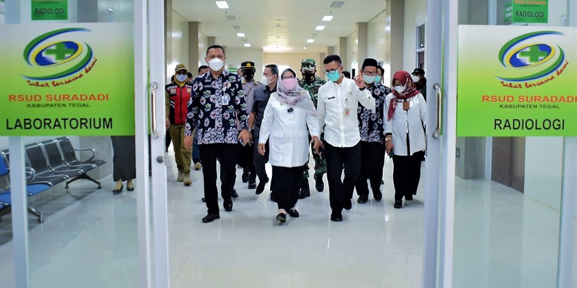 Suradadi – Tingkatkan kualitas pelayanan kesehatan masyarakat khususnya di wilayah Pantura, Bupati Tegal Umi Azizah meresmikan penggunaan gedung pelayanan penunjang RSUD Suradadi pada Rabu (15/12/2021) pagi. Oleh orang nomor satu di Kabupaten Tegal tersebut, gedung penunjang yang di dalamnya mencakup layanan laboratorium, radiologi dan instalasi bedah sentral ini dinamai Yos Sudarso.