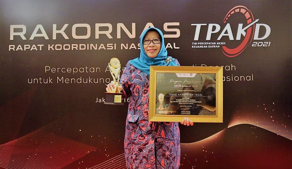 Penghargaan tersebut diserahkan Ketua Dewan Komisioner OJK RI Wimboh Santoso kepada Bupati Tegal Umi Azizah dalam Rapat Koordinasi Nasional (Rakornas) Tim Percepatan Akses Keuangan Daerah (TPAKD) 2021 yang diselenggarakan secara hybrid di Ballroom Hotel Grand Hyatt, Jakarta.