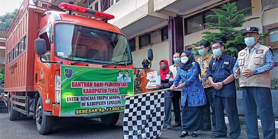 Slawi – Sebagai bentuk solidaritas atau kesetiakawanan sosial, Pemkab Tegal galang bantuan sosial untuk masyarakat terdampak erupsi Gunung Semeru. Bupati Tegal Umi Azizah bersama Kepala Badan Penanggulangan Bencana Daerah (BPBD) Kabupaten Tegal Jaenal Dasmin dan Ketua PMI Kabupaten Tegal Imam Sisworo melepas keberangkatan tim logistik pembawa bantuan sosial dari halaman parkir Setda Kabupaten Tegal, Jumat (17/12/2021) pagi.