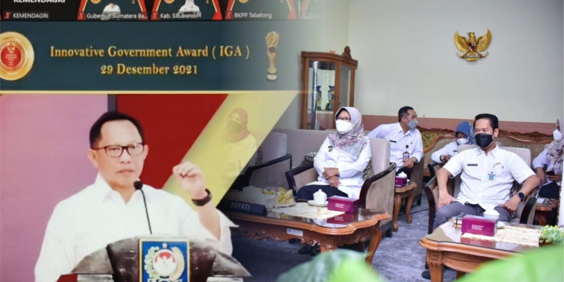 Slawi – Menutup akhir tahun 2021 ini, Pemkab Tegal mendapatkan anugerah penghargaan Kabupaten Terinovatif dari Kementerian Dalam Negeri (Kemendagri) RI pada ajang Innovative Government Award (IGA) 2021. Seremonial penganugerahan IGA ini diselenggarakan secara hybrid di Gedung Sasana Bhakti Praja Kemendagri, Jakarta dan disaksikan Bupati Tegal Umi Azizah dari Rumah Dinas Bupati Tegal, Rabu (29/12/2021).