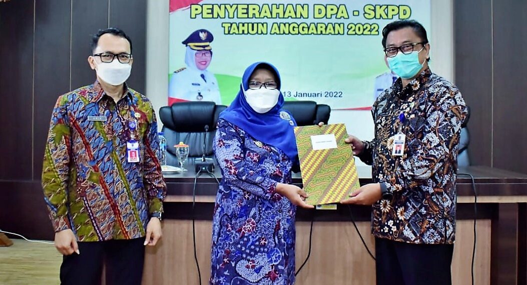 Slawi – Bupati Tegal Umi Azizah resmi serahkan dokumen pelaksanaan anggaran satuan kerja perangkat daerah (DPA SKPD) 2022 kepada seluruh kepala perangkat daerah termasuk camat di Kabupaten Tegal. Penyerahan dokumen berisi rincian rencana pendapatan, belanja, dan pembiayaan sebagai dasar pelaksanaan APBD Kabupaten Tegal 2022 ini berlangsung di Ruang Rapat Nusantara, Gedung Amarta, Setda Kabupaten Tegal, Kamis (12/01/2022) pagi.