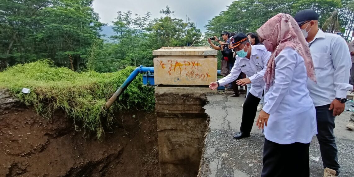 Balapulang – Bupati Tegal Umi Azizah tinjau Jembatan Gintung yang terputus di Desa Batuagung, Kecamatan Balapulang, Rabu (02/02/2022) pagi. Putusnya jembatan tersebut disebabkan longsornya salah satu sisi pondasi jembatan yang tergerus oleh derasnya arus Sungai Gintung saat curah hujan tinggi beberapa waktu belakangan ini.