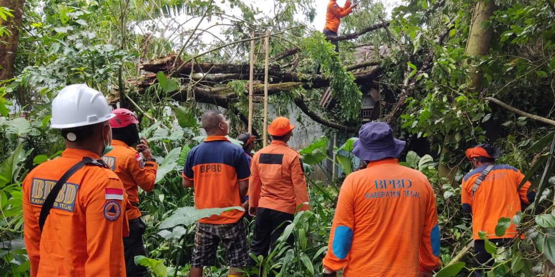 1. Tim BPBD Kabupaten Tegal sedang mengevakuasi pohon tumbang akibat angin kencang di Desa Kajenengan Rt 01 Rw 02 Kecamatan Bojong pada Rabu, 26 Januari 2022.