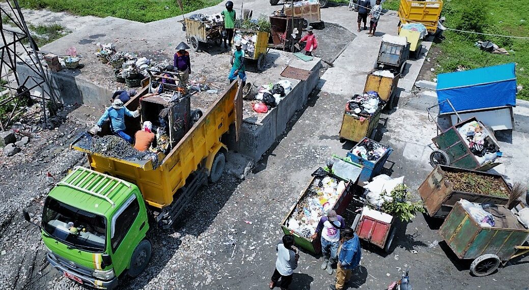 Aerial view tempat penampungan sementara (TPS) sampah di eks Pasar Hewan Curug, Pangkah yang menggunakan sistem panggung untuk memudahkan gerobak sampah masuk dan membongkar muatannya ke dalam truk sampah, Senin (11/04/2022).