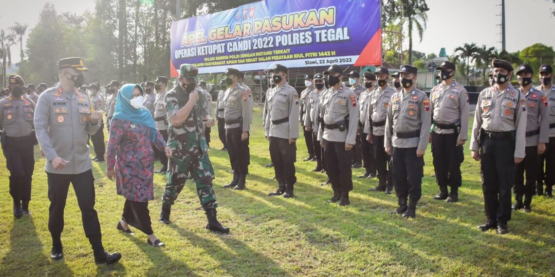 Bupati Tegal Umi Azizah (tengah) didampingi Kapolres Tegal AKBP Arie Prasetya Syafa'at (kiri) dan Komandan Kodim 0712/Tegal Letkol Inf Charlie Clay Lorando Sondakh (kanan) lakukan pengecekan personel saat berlangsung Apel Pasukan Operasi Ketupat Candi 2022 di Lapangan Pemkab Tegal, Jumat (22/04/2022).