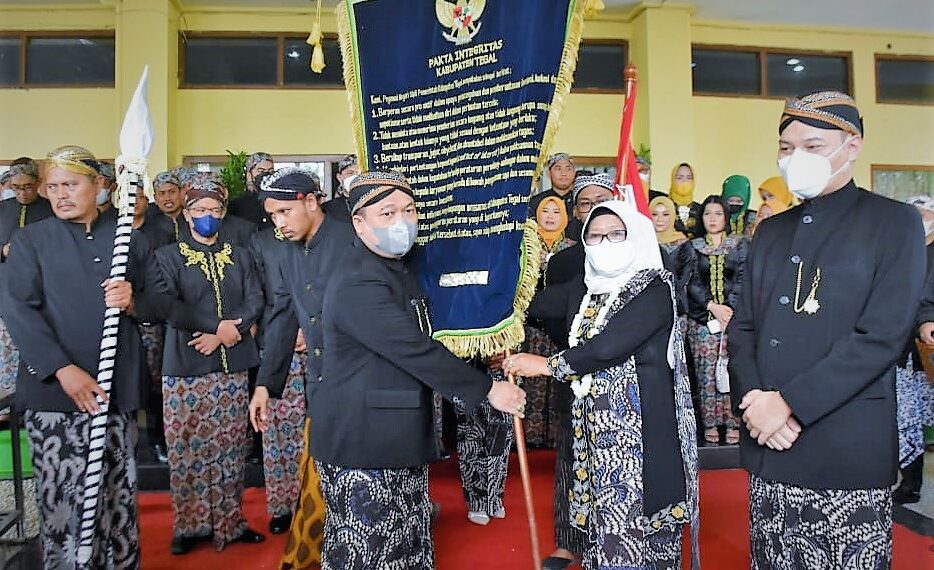 Bupati Tegal Umi Azizah menerima bendera Pakta Integritas pada acara Kirab Pataka Hari Jadi ke-421 Kabupaten Tegal di Gedung DPRD setempat, Rabu (18/5/2022). Bendera ini sebagai simbol amanat masyarakat kepada kepala daerah dalam menjalankan pemerintahan daerah yang berintegritas, terbebas dari praktik korupsi, kolusi dan nepotisme serta diskriminasi pelayanan publik.