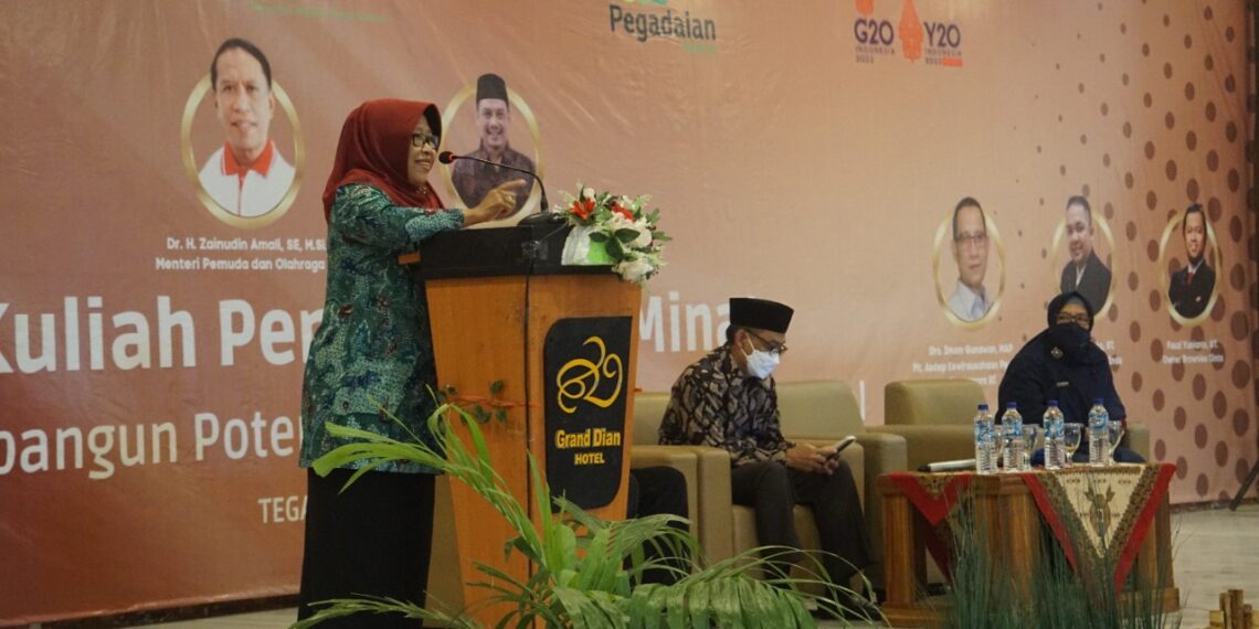 Pernyataan tersebut disampaikan Bupati Tegal Umi Azizah di hadapan 50 mahasiswa Politeknik Purbaya yang hadir secara luring dan 200 mahasiswa lainnya secara daring pada perkuliahan umum penumbuhan minat kewirausahaan pemuda di Hotel Grand Dian Slawi, Kamis (21/7/2022) sore.