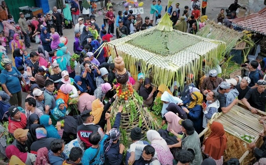 Bumijawa – Ratusan orang tampak berebut gunungan sayuran dan buah-buahan di acara ruwat bumi yang diselenggarakan di objek wisata Guci, Selasa (02/08/2022) siang. Animo warga setempat dan wisatawan pada acara tradisi tahunan kali ini sangat tinggi setelah sempat dua tahun kemarin penyelenggaraannya dilakukan secara sederhana akibat pandemi Covid-19.