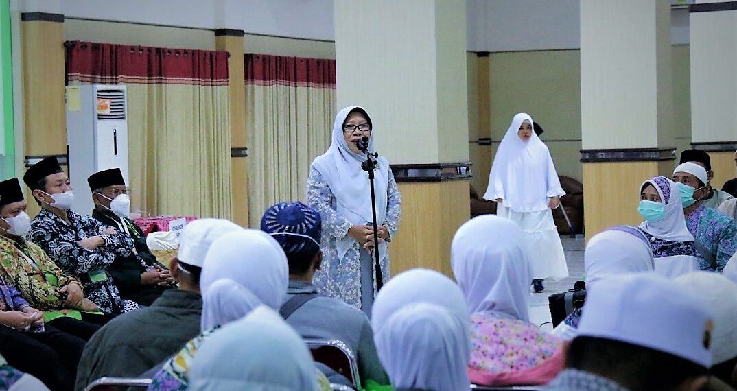 Bupati Tegal Umi Azizah memberikan sambutan penerimaan kedatangan jemaah haji kloter 24 asal Kabupaten Tegal di Asrama Haji Donohudan, Boyolali, Selasa (02/08/2022).