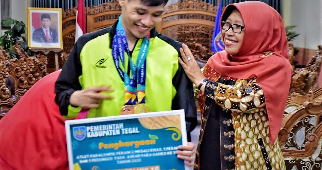 Slawi – Bupati Tegal Umi Azizah berikan bonus uang pembinaan senilai Rp 50 juta kepada atlet paralimpiade nasional Banyu Tri Mulyo yang telah berhasil memenangkan sejumlah nomor pertandingan pada cabang olahraga tenis meja di ASEAN Para Games 2022. Setidaknya dua medali emas, satu perak dan satu perunggu berhasil diraih pemuda asal Dukuhsalam ini.