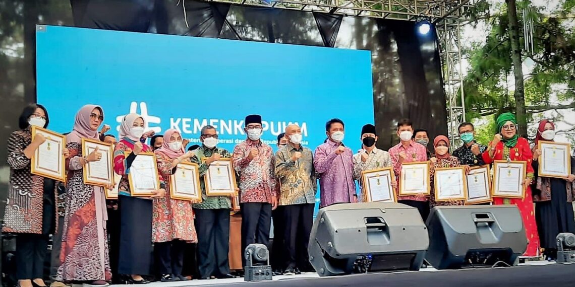 Bandung – Pemkab Tegal berhasil meraih dua penghargaan nasional Jasa Bakti Koperasi dan UKM dari Kementerian Koperasi dan Usaha Kecil dan Menengah (KemenKopUKM) Republik Indonesia. Penyerahan penghargaan pada peringatan Hari Nasional (Harnas) UMKM 2022 ini dilakukan oleh Menkop UKM Teten Masduki kepada Asisten Perekonomian dan Pembangunan Setda Kabupaten Tegal Hendadi Setiaji di Cihampelas Walk Kota Bandung, Jumat (12/08/2022) lalu.