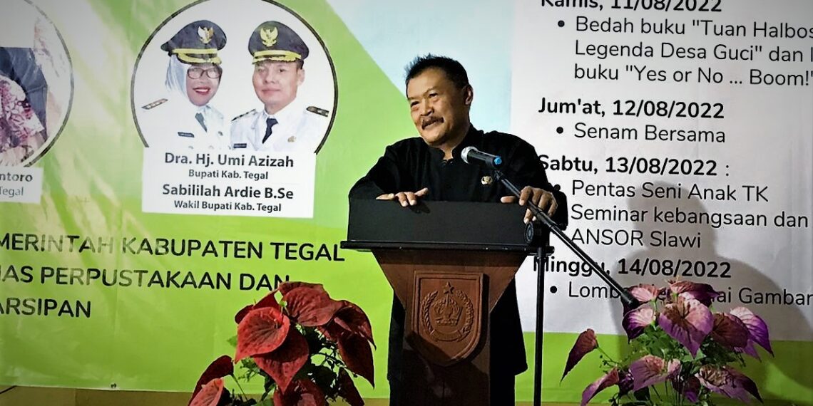 Kepala Dinas Perpustakaan dan Kearsipan Kabupaten Tegal Eko Jati Suntoro saat menutup pelaksanaan Bazar Sejuta Buku Murah di Gedung Rakyat Slawi, Kamis (18/08/2022).