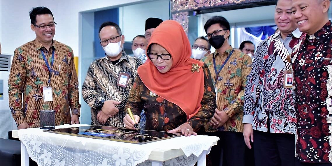Bupati Tegal Umi Azizah menandatangani prasasti saat peresmian Kantor Bank Jateng KCP Banjaran, Kecamatan Adiwerna pada Senin (19/09/2022).