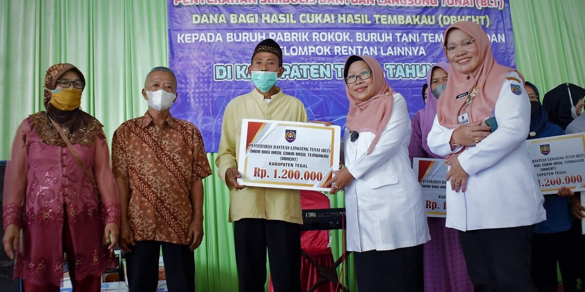 Kramat – Bupati Tegal Umi Azizah salurkan bantuan langsung tunai (BLT) Dana Bagi Hasil Cukai Hasil Tembakau (DBHCHT) APBD Kabupaten Tegal 2022 kepada 2.416 orang penerima manfaat yang terdiri dari buruh pabrik rokok, buruh tani tembakau, dan kelompok sosial lainnya seperti penyandang disabilitas maupun lansia.