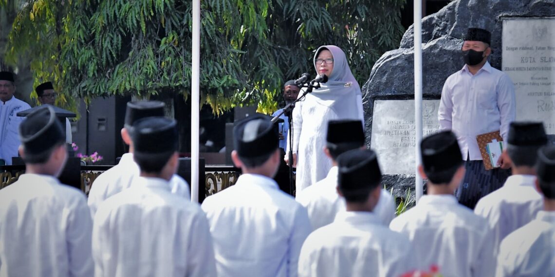 Bupati Tegal Umi Azizah memimpin upacara bendera peringatan Hari Santri Nasional (HSN) Tahun 2022 di lapangan kantor Pemda Kabupaten Tegal, Sabtu (22/10/2022).