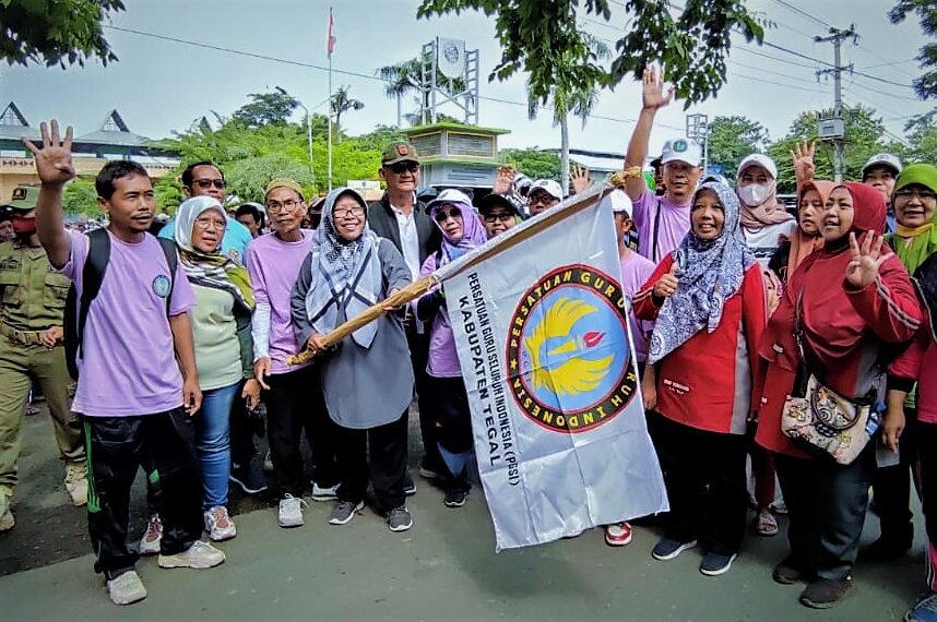 Slawi – Peringati hari lahir-nya (Harlah) yang ke-11, para guru swasta yang tergabung dalam Persatuan Guru Seluruh Indonesia (PGSI) Kabupaten Tegal menggelar acara jalan sehat. Acara jalan sehat bersama Bupati Tegal Umi Azizah ini berlangsung di GOR Tri Sanja Slawi, Minggu (13/11/2022) pagi.