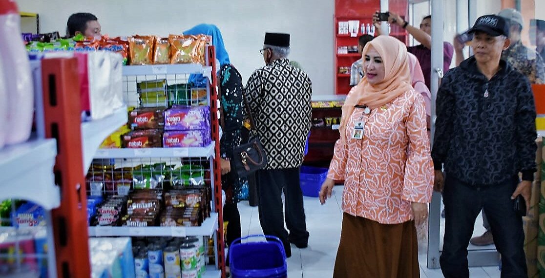 Kepala Dinas Koperasi UKM dan Perdagangan Kabupaten Tegal Suspriyanti meninjau kelengkapan toko saat peresmian pembukaan minimarket D’Mart di Desa Dukuhlo, Kecamatan Lebaksiu, Kamis (01/12/2022).