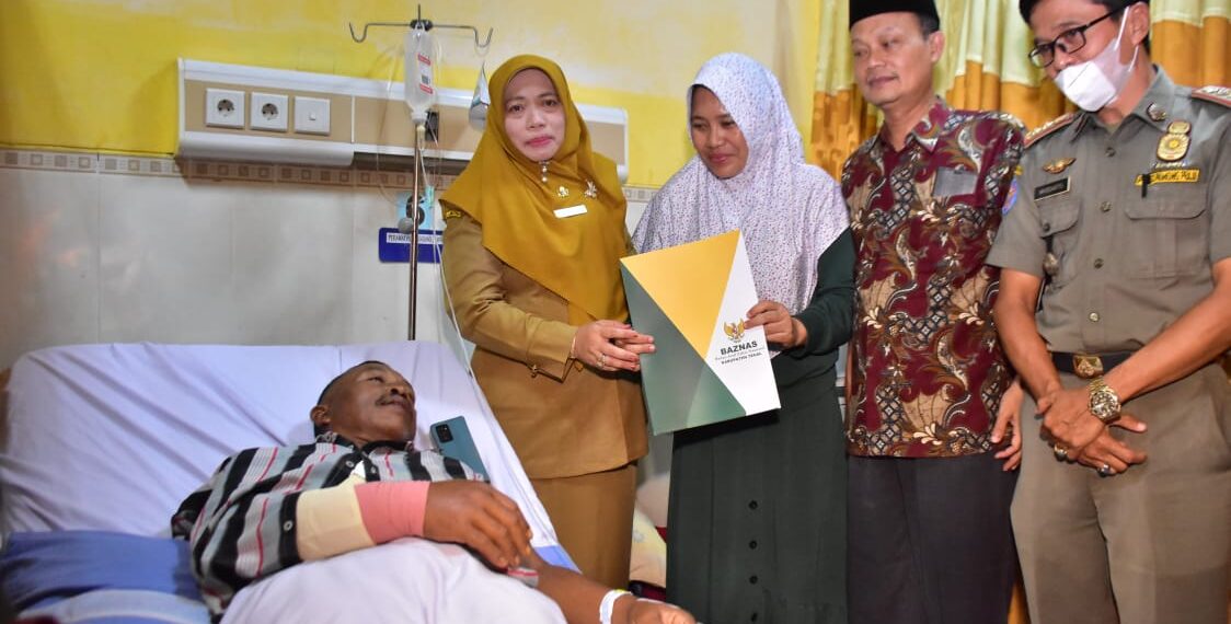 Slawi – Pejabat Pelaksana Kepala Dinas Sosial (Dinsos) Kabupaten Tegal Nurhayati didampingi Wakil Ketua Badan Amil Zakat Nasional (Baznas) Kabupaten Tegal Nurul Huda salurkan bantuan pengobatan kepada Wiyoso (57) di RSUD dr Soeselo Slawi, Selasa (27/12/2022) sore. Wiyoso adalah korban luka akibat tertimpa pohon randu yang tumbang di jalan raya Slawi-Pangkah pada Minggu (25/12/2022) lalu.