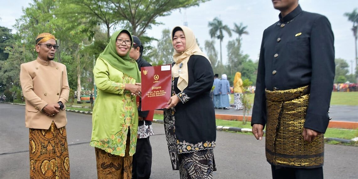 Slawi – Sebanyak 7.777 orang berpakaian adat nusantara ikuti upacara peringatan Hari Amal Bhakti (HAB) ke-77 Kementerian Agama (Kemenag) RI. Tak terkecuali pula Bupati Tegal Umi Azizah yang mengenakan pakaian kebaya saat memimpin jalannya upacara di lapangan Kantor Pemda Kabupaten Tegal, Selasa (03/01/2023) pagi.