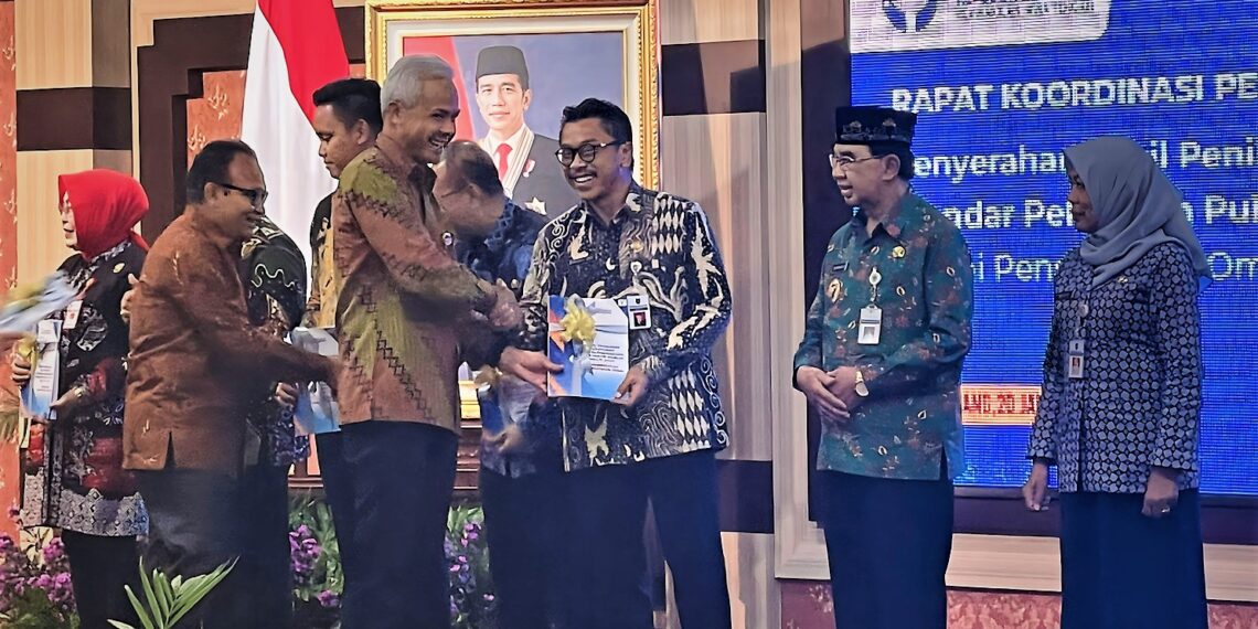 Sekretaris Daerah Kabupaten Tegal Widodo Joko Mulyono saat menerima hasil penilaian kepatuhan standar pelayanan publik pemerintah daerah tahun 2022 dari Ombudsman RI. Hasil penilaian ini diserahkan Gubernur Jawa Tengah Ganjar Pranowo di Gedung Gradhika Bhakti Praja, Kantor Gubernur Jawa Tengah, Semarang, Jumat (20/01/2023).