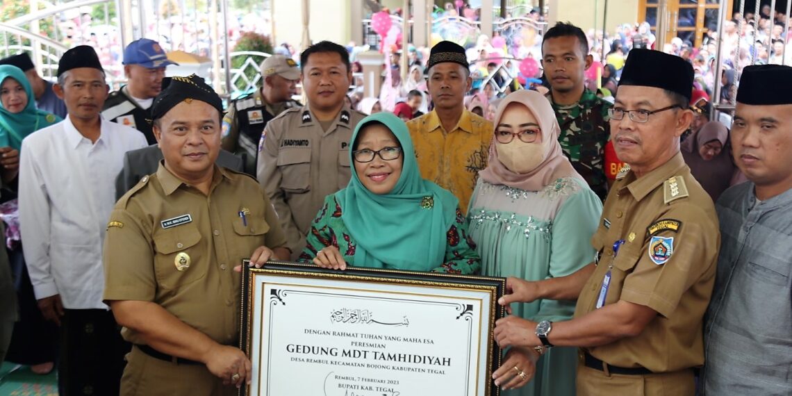 Bupati Tegal Umi Azizah (berdiri paling depan, kedua dari kiri) menunjukkan prasasti yang ditandatanganinya sebagai tanda diresmikannya MDT Tahmidiyah Rembul pada Selasa (07/02/2023).