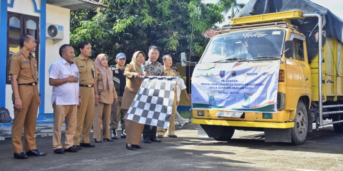 Slawi – Ringankan beban pengeluaran rumah tangga miskin, Badan Pangan Nasional melalui Pemerintah Kabupaten Tegal salurkan 1.322 ton beras cadangan pangan pemerintah (CPP) ke 132.288 penerima bantuan pangan di Kabupaten Tegal untuk periode April, Mei dan Juni 2023. Penyaluran beras CPP ini secara simbolis dilakukan Bupati Tegal Umi Azizah dari Gudang Bulog Procot, Slawi, Selasa (11/04/2023).