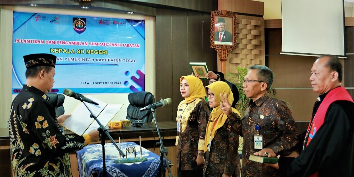 Slawi – Kepala sekolah diminta transparan dan akuntabel dalam mengelola dana bantuan operasional sekolah (BOS) untuk mencegah penyelewengan atau menjadi objek kepentingan pihak-pihak tertentu. Pesan ini disampaikan Bupati Tegal Umi Azizah melalui Asisten Administrasi Umum Sekda Kabupaten Tegal Fakihurrohim saat melantik tiga orang Kepala Sekolah Dasar Negeri (SDN) di Ruang Rapat Bupati Tegal, Jumat (01/09/2023).