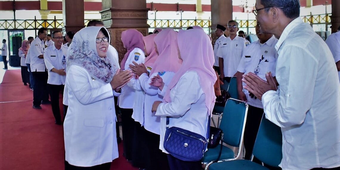 Bupati Tegal Umi Azizah menyalami PNS Pemkab Tegal yang akan memasuk masa purnanya tanggal 1 November dan 1 Desember 2023 di Pendopo Amangkurat, Rabu (06/09/2023).