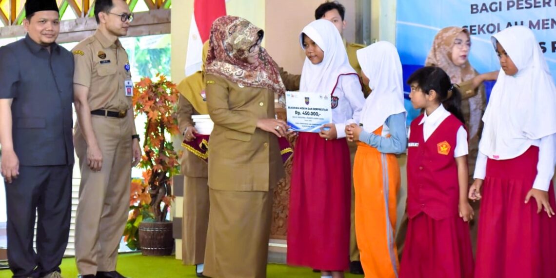 Bupati Tegal Umi Azizah secara simbolis menyerahkan beasiswa kepada peserta dari keluarga miskin maupun berprestasi di Pendopo Amangkurat, Senin (16/10/2023).