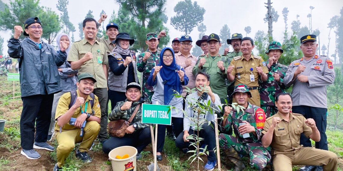 Simbolis penanaman bibit pohon dari donasi badan usaha milik daerah (BUMD) air minum ini dilakukan oleh Bupati Tegal Umi Azizah dan unsur Forkopimda di dalam kawasan hutan lindung yang masuk wilayah Dukuh Sawangan, Desa Sigedong, Kecamatan Bumijawa, Senin (20/11/2023).