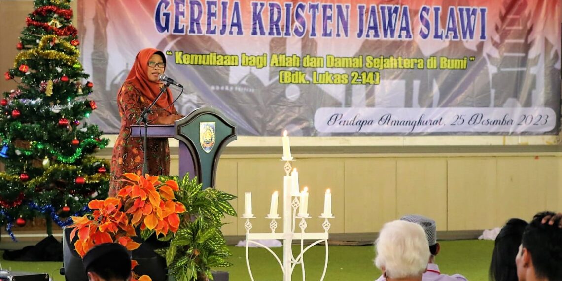 Bupati Tegal Umi Azizah saat menyampaikan pesannya pada Perayaan Natal bersama Gereja Kristen Jawa (GKJ) Slawi yang berlangsung di Pendopo Amangkurat Kabupaten Tegal, Senin (25/12/2023).