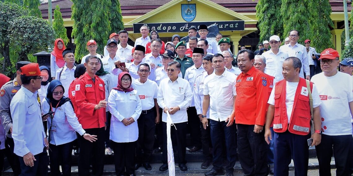 Slawi – Ketua Umum Palang Merah Indonesia (PMI) Mohammad Jusuf Kalla didamping Bupati Tegal Umi Azizah melepas bantuan droping air bersih di acara puncak peringatan Hari Relawan PMI Tahun 2023 tingkat nasional yang berlangsung di Pendopo Amangkurat Kantor Pemkab Tegal, Selasa (26/12/2024).